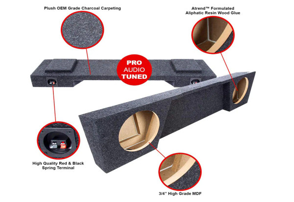Atrend vehicle-specific enclosures are designed to fit within specific vehicle applications to help minimize the space of the subwoofer and also cleanly integrate into your vehicle without standing out.