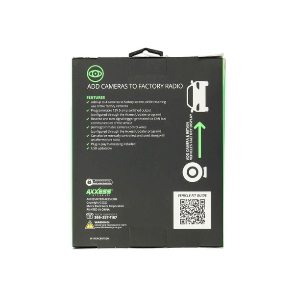 Looking to add a backup camera or any CAN-activated camera to your factory radio screen? Axxess offers a plug-n-play interface, AXAC, for select vehicle applications that allow you to add up to 4 CAN-activated cameras. The AXAC package includes the interface and vehicle-specific harness. Check our Vehicle Fit Guide to see if an AXSC is available for your vehicle, as these products are dependent on the vehicle application.